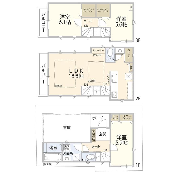 1号棟 間取図 3LDK+WIC インナーガレージで大切お車を保管いただけます。